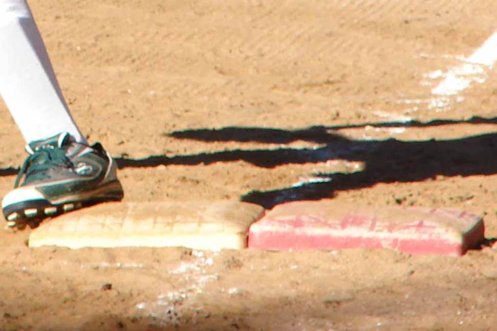 At first base, there is a white base in the regular location. There’s also a RED base next to it, in foul territory. When there’s a “play” at first, the fielder must step on the white base and the runner must step on the red base. This is intended to minimize collisions and may result in runners who seem to be safe being called “OUT” or runners who seem to be thrown out being called “SAFE”.